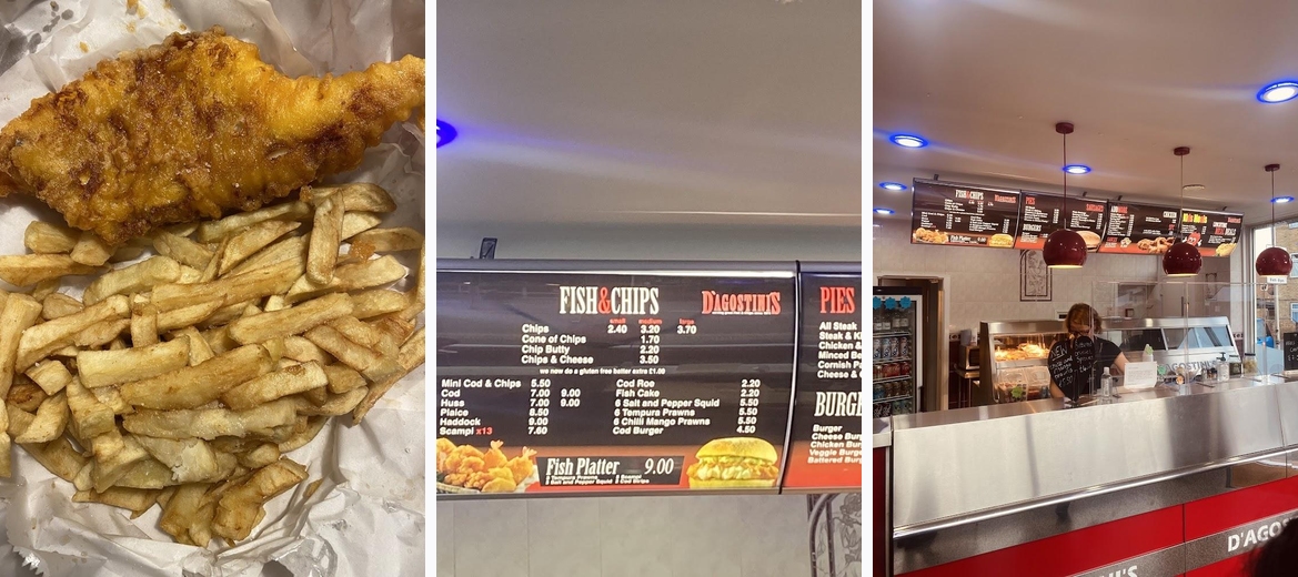 Indulge in the best fish and chips in Folkestone at D'Agostini's! Enjoy fresh, delicious meals with generous portions, perfect for lunch or dinner. Offering takeaway, delivery, and casual dining, we cater to everyone, including kids and vegans. Plan your visit today for a quick bite or late-night craving!